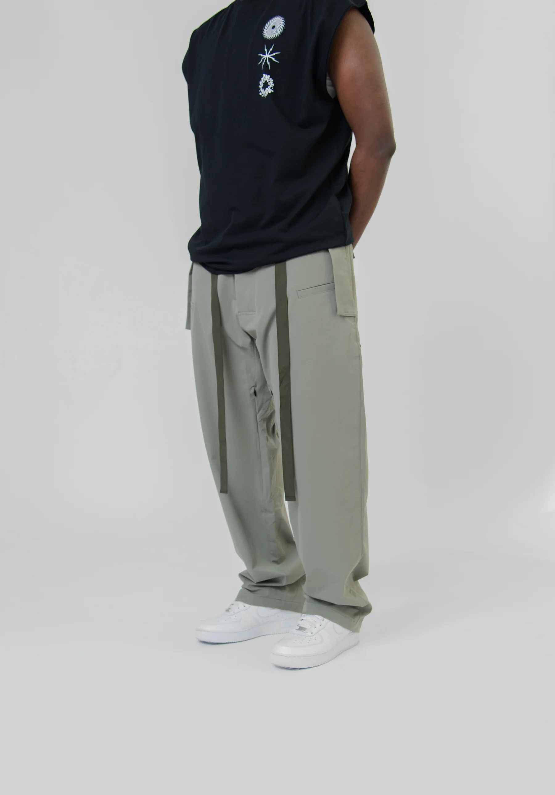 - Integrated beltless drawcord waist