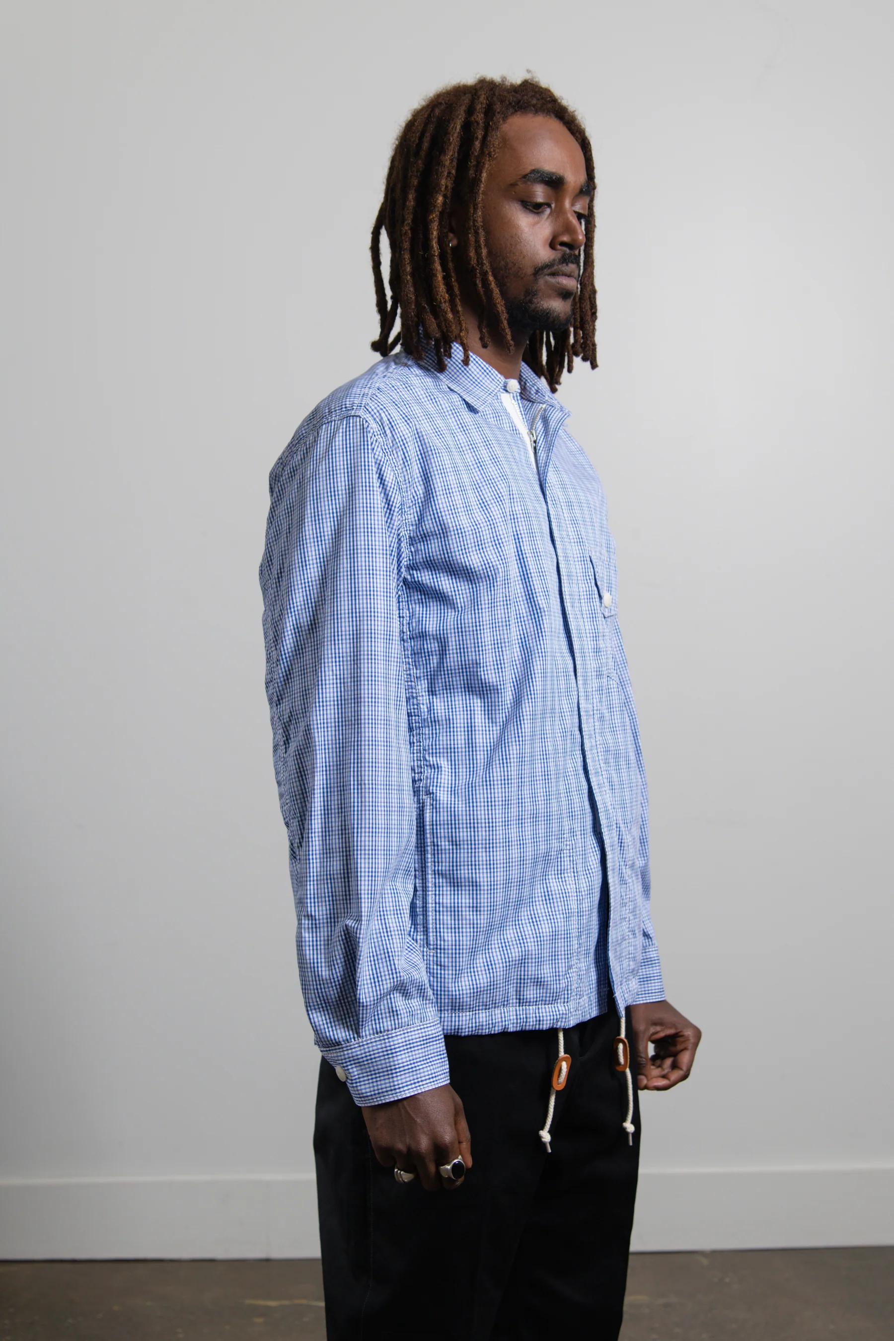- Long sleeve checkered cotton poplin jacket in Blue and White