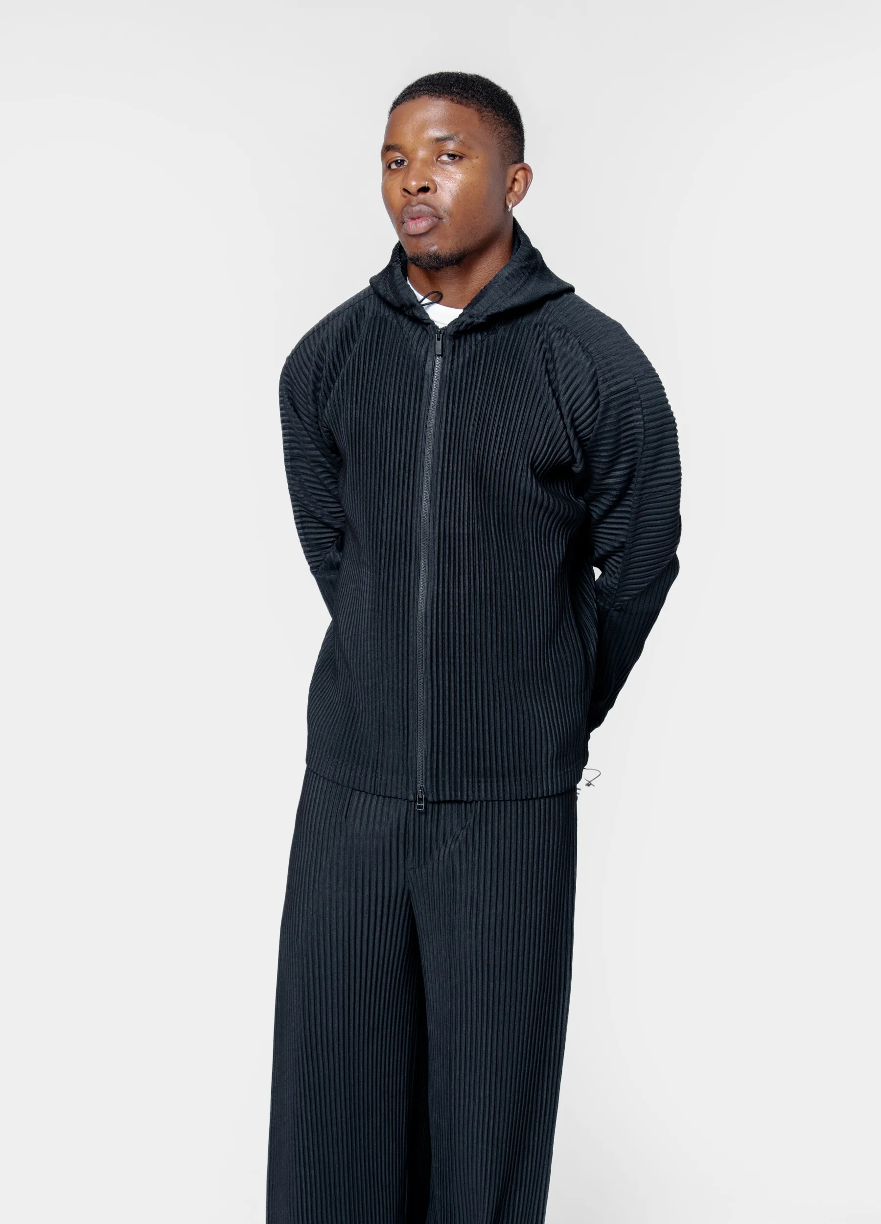 - Long sleeve garment-pleated zip hoodie in Black