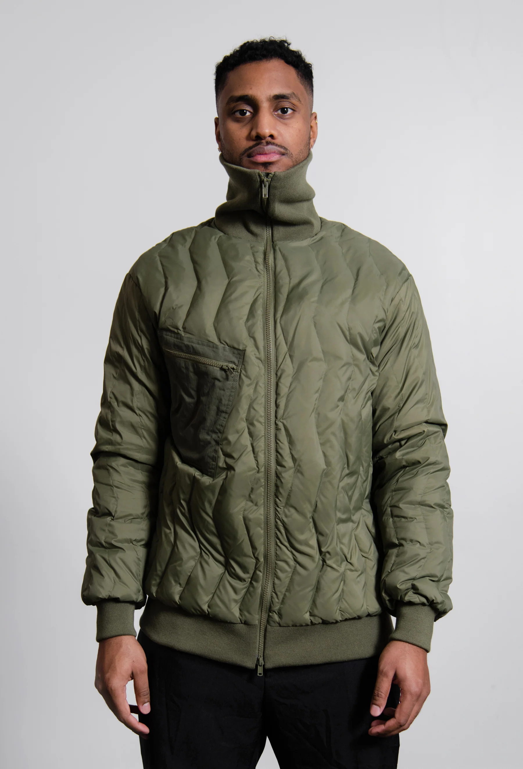 - Long sleeve, down-filled, zig-zag quilted bomber jacket in OliveĀ